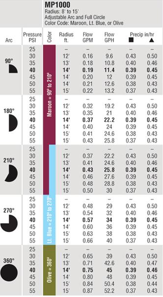 *To achieve maximum radius reduction with any MP1000 model, use a 30 PSI (2 BAR) pressure regulating spray body.