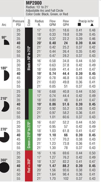 The MP2000 Rotator is a 13-21' (4-6.4 meter) sprinkler (including the 25% radius reduction* capability) that fits any conventional spray head body or shrub adapter.