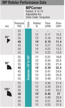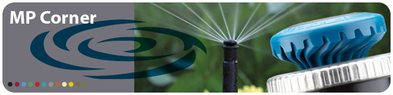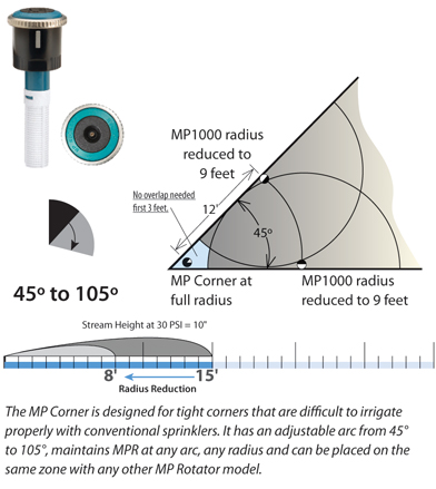 The MP Corner is an 8-15' (2.5-4.6 meter)sprinkler designed for tight corners that are difficult to irrigate properly with conventional sprinklers. It has an adjustable arc from 45° to 105°, maintains MPR at any arc, any radius and can be placed on the same zone with any other MP Rotator model.