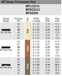 The MP Left & Right Strips irrigate an area 5’ x 15’ (1.5-4.6 m) at 30 PSI (2.1 bar) at full radius. Flow rate at rectangular spacing = .19 GPM (.72 LPM). When the radius is reduced the pattern is 4’ x 12’ (1.2-3.7 m). Flow rate at rectangular spacing = .14 GPM (.53 LPM).