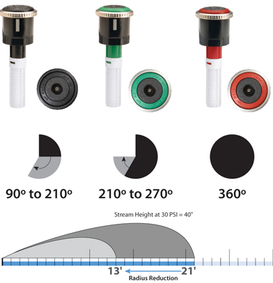 The MP1000 Rotator is a 8-15' (2.5-4.6 meter) sprinkler (including the 25% radius reduction* capability) that fits any conventional spray head body or shrub adapter.