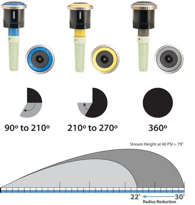 THE MP3000 Rotator is a 22-30' (6.7-9 meter) sprinkler (including the 25% radius reduction* capability) that fits any conventional spray head body or shrub adapter.