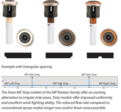 The MP Side Strip irrigates a strip 5’ x 30’ (1.5-9.1 m) at 30 PSI (2.1 bar) at full radius. Flow rate at rectangular spacing = .38 GPM (1.44 LPM). When the radius is reduced the pattern is 4’ x 24’ (1.2-7.3 m). Flow rate at rectangular spacing = .27GPM (1.02 LPM)